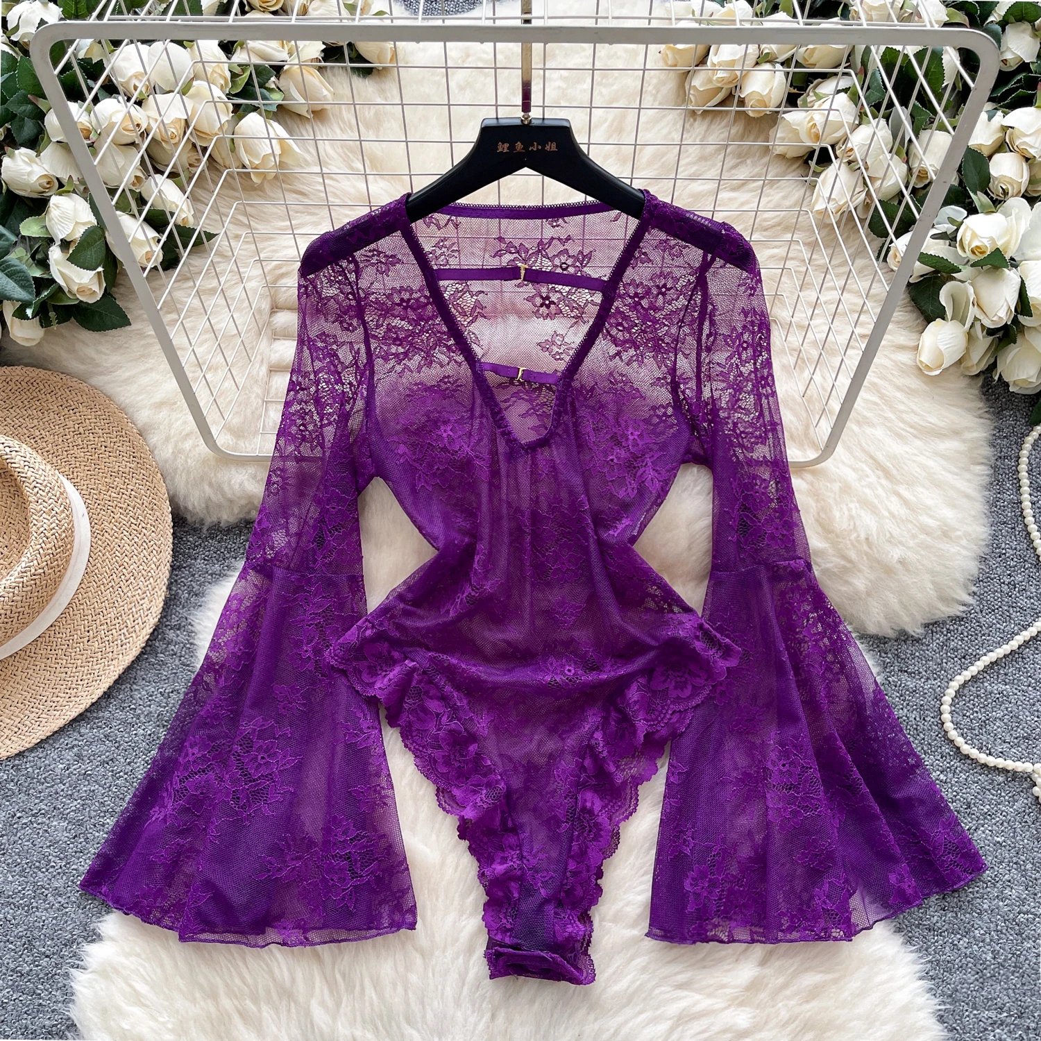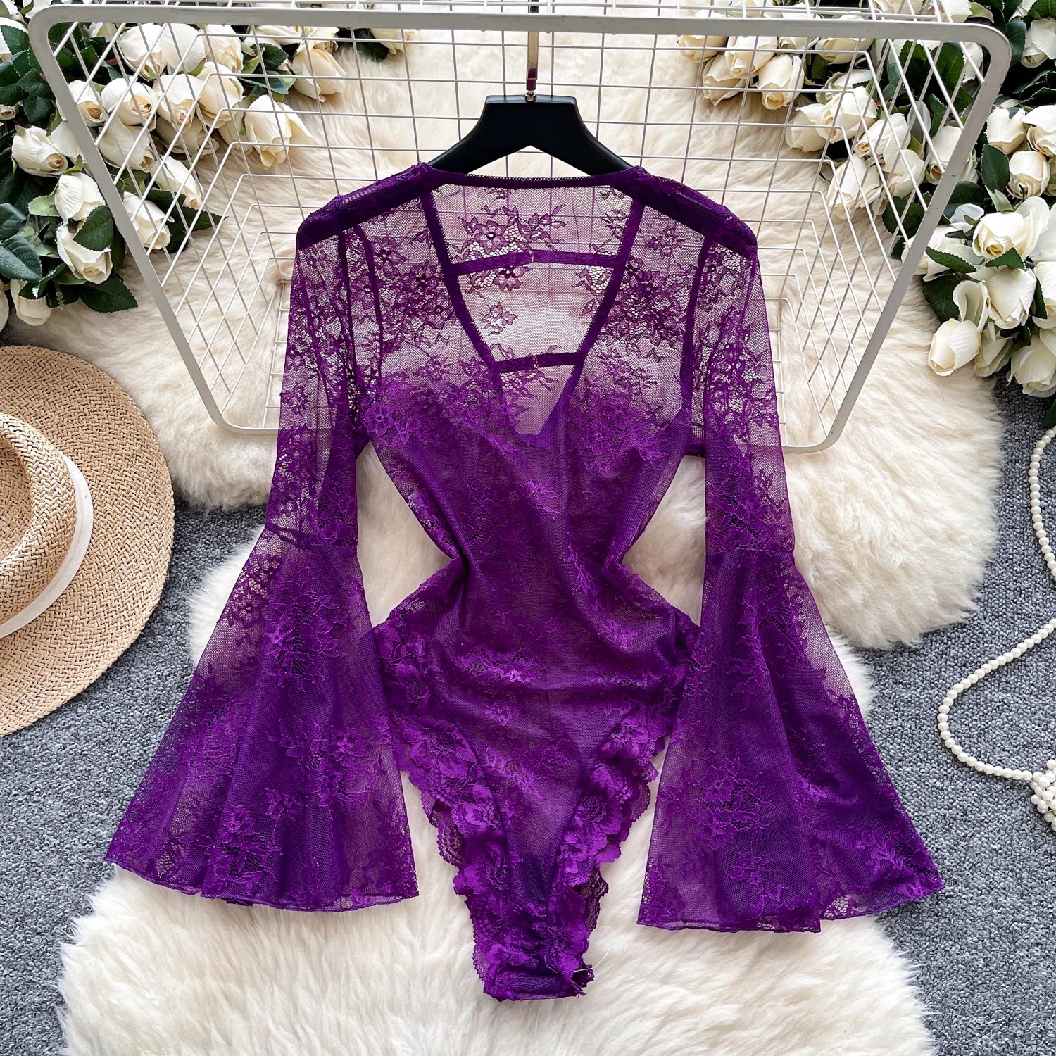 اكتشفي الأناقة الفائقة مع بودي سوت الدانتيل البنفسجي الساحر. يتميز هذا التصميم الرائع بقماش دانتيل فاخر يضفي لمسة من الفخامة والأنوثة. اللون البنفسجي الحيوي يعكس جاذبية فريدة ويبرز تفاصيل التصميم بوضوح. يتميز البودي سوت بأكمام طويلة واسعة تضيف لمسة من الرقي والتميز، مع قصّة عصرية تتماشى مع صيحات الموضة الحديثة.